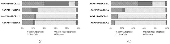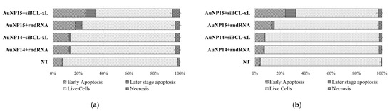 The size of the apoptotic fraction increased upon the addition of AuNP complexes with both the target siRNA and a random sequence. Moreover, there were no differences between complexes based on different siRNAs in the case of AuNP14; the corresponding populations differ to within a standard deviation. In the case of AuNP15, there was a significant difference in apoptosis for the target and random sequences for both cell lines. The level of necrosis in all cases was low, with a maximum value being 5.87 ± 0.75% for the AuNP15-siBCL-xL complexes for HL-60 cells.