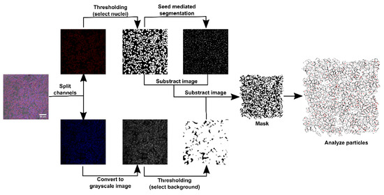 After the image acquisition, we performed the semiquantitative analysis in ImageJ 2.0. The three channels (DIC, blue emission and red emission) were split. The channel corresponding to the blue light emission of the CQDs was transformed in a grayscale image. Thereafter, we applied a threshold filter in order to select pixels corresponding to the background noise. Consequently, we transformed this image into a 2-bit mask. The channel corresponding to the red-light emission of the DRAQ5 labeled nuclei was transformed in a 2-bit mask using a threshold filter. Thereafter, we ran a seed mediated segmentation starting from every nucleus. Then, we subtracted this image from the nuclei mask and the resulted image from the background mask. These steps (Figure 1) led to a mask of objects that correspond to cells without nuclei. This allowed us to calculate the mean intensity and area of every cell’s cytoplasm in the grayscale image corresponding to CQDs emission. This step was performed using the analyze objects function in ImageJ.