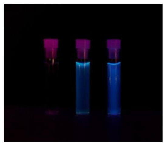 Optical images of three vials exposed to UV light: water (left), 10× diluted CQDs solution (middle) and non-diluted CQDs solution (right).