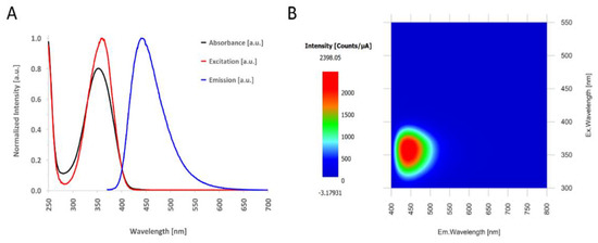 (A) The absorbance spectrum of the as-prepared CQDs solution (black), the excitation spectrum (red) and the emission spectrum of the CQDs (blue) when exposed to a 360 nm excitation light. (B) Excitation and emission matrix (EEM) of the as-prepared CQD solution.