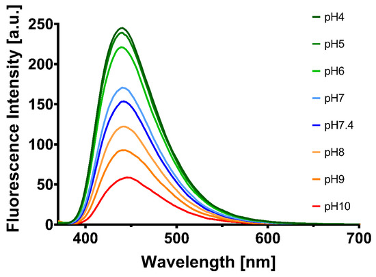 Moreover, the stability of the NPs was investigated at different pH values, as shown in Figure 5. The CQDs showed high stability in acidic media (high fluorescence intensity at pH 4–7), while their intensity decreased significantly at higher pH values.