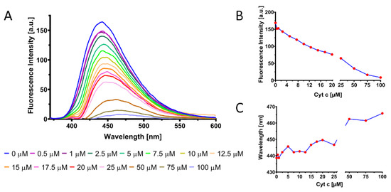 (A) Spectra showing the fluorescence intensity of CQDs in the presence of various concentrations of Cyt c. (B) Relationship between Cyt c concentration and CQDs maximum fluorescence intensity. (C) Lambda shift exhibited by the CQDs solution in the presence of various Cyt c concentrations.
