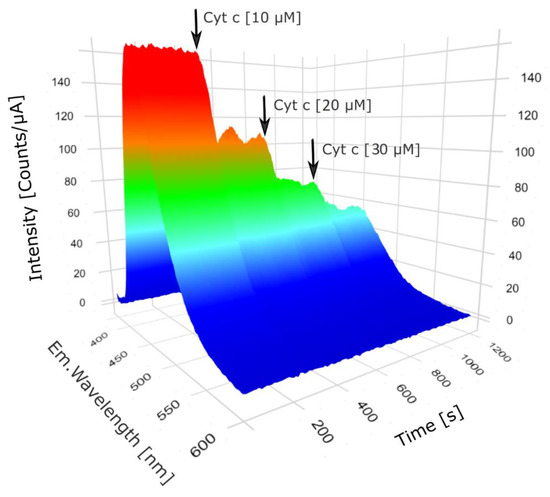 Another investigation focused on the CQDs fluorescence intensity variations as a result of Cyt c addition at different time points. Fluorescence spectra were measured every 10 s for 20 min. Cyt c was added up to a final concentration of 10, 20 and 30 µM, at 5, 10 and 15 min respectively. The fluorescence emission was detected between 370 and 600 nm. A 360 nm excitation wavelength was used, excitation and emission bandpasses were 5 nm, and the integration time was set to 0.05 s.