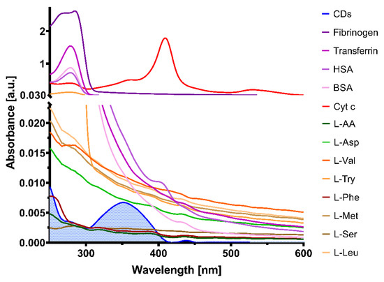 To test the hypothesis that the quenching effect is obtained mostly due to the presence of Cyt c in the proximity of CQDs, other biological molecules such as human serum albumin, bovine serum albumin, fibrinogen, transferrin and amino acids were investigated. In this regard, absorbance and emission spectra were collected to highlight possible interferences of these molecules at 20 µM with CQDs spectra. Absorbance spectra was read between 250–800 nm (Figure 8), while emission spectra were read between 370–800 nm with excitation at 360 nm (Figure 9).