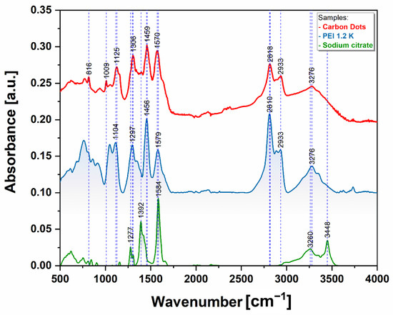 FTIR spectra of the CQDs (red) and of the precursors, sodium citrate (green) and PEI 1.2 K (blue) in the spectral range 400–4000 cm−1. The spectra were baseline corrected, normalized, and vertically shifted for better clarity.