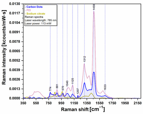 Raman spectroscopy was employed in order to further prove the molecular species present on the outer surface of the CQDs (Figure 12). As such, we recorded the spectrum of the CQDs (blue curve) together with the spectra of the only two precursors that were used during the synthesis: PEI (magenta curve) and sodium citrate (olive curve). The spectra were recorded using a NIR excitation laser (785 nm). The Raman spectrum of the CQDs presents many similarities with the only two compounds employed in their synthesis. The major vibrational peaks detected in the case of CQDs (881, 970, 1040, 1125, 1312 and 1459 cm−1) can be assigned to different vibrational modes of PEI. The presence of these PEI specific vibrational bands represents irrefutable proof of the presence of this biocompatible polymer on the outer surface of CQDs as it was also shown by means of FTIR spectroscopy.
