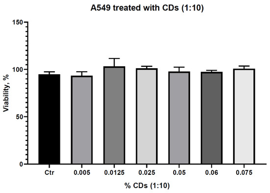 As estimated from previous literature studies, the CQDs solution showed negligible cytotoxicity [37] on A549 cells proven by an MTT assay for different concentrations of the as-prepared colloidal solution (0.075%, 0.06%, 0.05%, 0.025%, 0.0125%, 0.005%) (Figure 13). All the viabilities were higher than 90%, suggesting that the CQDs were not cytotoxic.