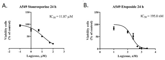Viability rate of A549 cells treated with various concentrations of staurosporine (A) and etoposide (B).