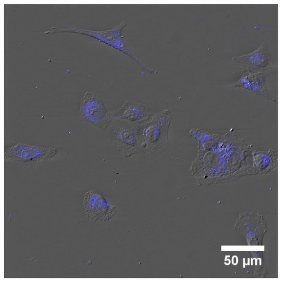 A549 cells were grown in chamber slides and treated with a 10% solution of the as-prepared CQDs for 4 h and mounted in Prolong Gold Mounting Medium for confocal microscopy observations. The specimen was excited using a 405 nm laser and scanned using two channel mode (DIC and blue emission). The DIC images clearly presented the cells and their nuclei, and the blue fluorescence confirmed the internalization of the CQDs (Figure 15). We observed low fluorescence intensity in the nucleus, suggesting that only a small amount of fractions of the carbon dots could pass the nuclear envelope, probably due to their physicochemical properties and not their size. The surface chemistry of the NPs is a key factor in cellular and subcellular level internalization [38]. Conversely, it was reported that metallic NPs smaller than 9 nm could freely bypass the nuclear envelope [39].