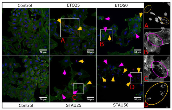 Morphological changes induced by Eto and Stau in A549 cell line at IC25 and IC50. Yellow arrows indicate nuclear fragmentation/damage and magenta arrows show cytoskeleton degradation. The panel in the right presents single channel regions of interest to highlight the structural features in a more detailed manner.