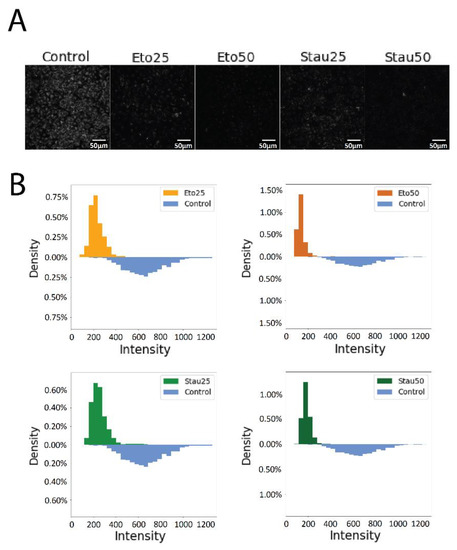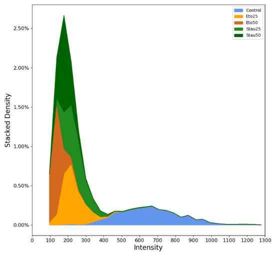 These steps were performed for 3 different images corresponding to every group (control, ETO25, ETO50, STAU25, STAU50). The intensity distribution was plotted for every group as compared to the control group, and different tests were performed to show the statistical significance.