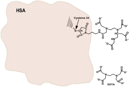 Schematic representation of EDTA and the monomodified HSA-EDTA derivative (HSA-S-MAL-(CH2)2-NH-CO-EDTA).