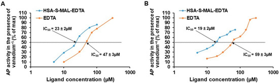 Figure 2A shows the reversal of NaVO3 (+5) evoked inhibition of acid phosphatase by EDTA, EDTA-maleimide and HSA-EDTA at pH 7.3. Half-maximal values were 47, 56 and 23 µM for EDTA, EDTA-maleimide and HSA-EDTA respectively. Figure 2B demonstrates the reversal of VOCl2 (+4) evoked inhibition of acid phosphatase by those ligands. In this case, half maximal values amounted to 59, 71 and 19 µM for EDTA, EDTA-maleimide and HSA-EDTA respectively. Thus the associating affinity toward both forms of this metalooxide increased 3–4 folds (Figure 2) when this chelator is linked to cysteine-34 of this carrier protein.