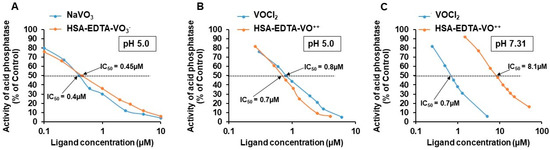 Dose-dependent inhibition of acid phosphatase at pH 5.0 and 7.31 by Sephadex-purified HSA-EDTA-vanadium and the free metalooxides. The incubation assay was run for 40–60 min at 25 °C in tubes (0.6 mL) containing 0.1 M KCl-1 mM HCl (pH 5.0, A,B) or 0.1 M KCl-100 mM Hepes buffer (pH 7.31, C). Each tube contained PNPP (0.2 mM), 5 µg acid phosphatase (A,B) or 25 µg (C) and the indicated concentrations of HSA-EDTA-vanadium or the free metalooxide. The assay was terminated with NaOH, upon reaching OD410 = 0.9 ± 0.1 in tubes having no HSA-EDTA-vanadium or the free metalooxide. Results are expressed as the mean ± SEM of three independent experiments.