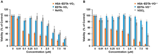 Anti-proliferative efficacies of free metalooxide, 1:1 complexes of EDTA and vanadium, and HSA-EDTA-vanadium conjugates in the CNS-1 glioma cell line. Dose-dependent toxicity experiments were conducted as described in the Section 2. HSA-EDTA-VO3−, NaVO3, and EDTA-VO3− (A) or HSA-EDTA-VO++, VOCl2, and EDTA-VO++ (B) were added to the cell culture for 72 h before MTT toxicity assay was applied to determine their anti-proliferative efficacies. Experiments were repeated at least three times in quadruplicate. Data are presented as the mean percentage ±SEM. n = 12 per treatment from at least 3 different experiments.