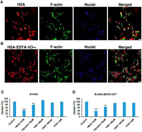 Uptake of HSA and HSA-EDTA-VO++ into CNS-1 glioma cell line is a caveolae-mediated endocytosis process. Rhodamine-labeled HSA (A) and HSA-EDTA-VO++ (B) (5 µM) were incubated with the cells for 1 h. The cells were washed, fixed, and mounted on cover slips. The uptake of the compounds was visualized with a fluorescence microscope. The cells were counter stained with phalloidin (green) and Hoechst (blue) for actin filaments and nuclei, respectively. Different blockers were used to determine the mechanism of entry of Rhodamine-labeled HSA (R-HSA) (C) and R-HSA-EDTA-VO++ (D). Data presented as mean ± SEM, n = 9 from three different experiments. ** p < 0.01, *** p < 0.001. Bar, 50 µm.