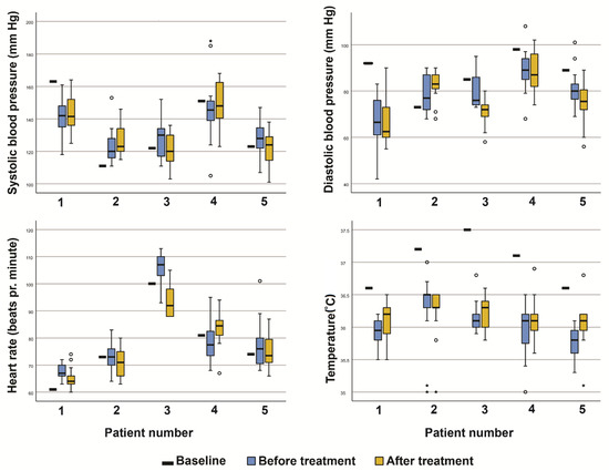 Systolic and diastolic blood pressure, heart rate, and temperature of patients, as measured at baseline and before and after each day in all treatment-cycles. (Boxplot with; median, 25th and 75th percentile, whiskers—value which is not an outlier or an extreme score, ° outlier more than 1.5 box lengths from the box, * extreme case more than 3 box lengths from the box.)