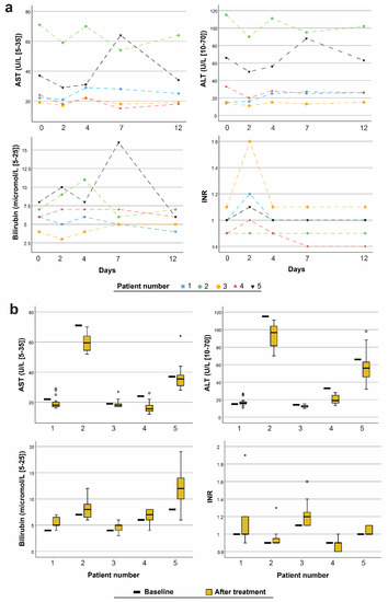 (a) Measurements of aspartate transaminase (AST), alkaline phosphatase (ALT), bilirubin, and international normalised ratio (INR) for each patient at baseline and on day 2 of treatment and days 4, 7, and 12 following the first treatment-cycle. (b) Measurements of AST, ALT, bilirubin, and INR at baseline and after day 2 of each treatment-cycle. (Boxplot with; median, 25th and 75th percentile, whiskers—value which is not an outlier or an extreme score, ° outlier more than 1.5 box lengths from the box, * extreme case more than 3 box lengths from the box.)