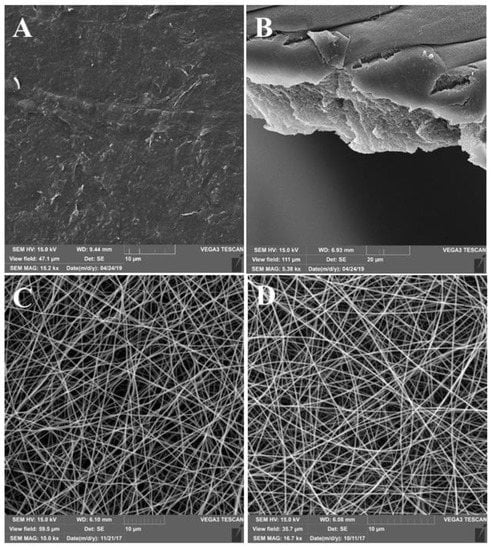 Electrospun scaffolds were characterized by a microfibrous structure (Figure 1C,D). Fibers were randomly arranged in several layers that form a porous mat. The approximate thickness of the fiber was in the range of 300–700 nm.
