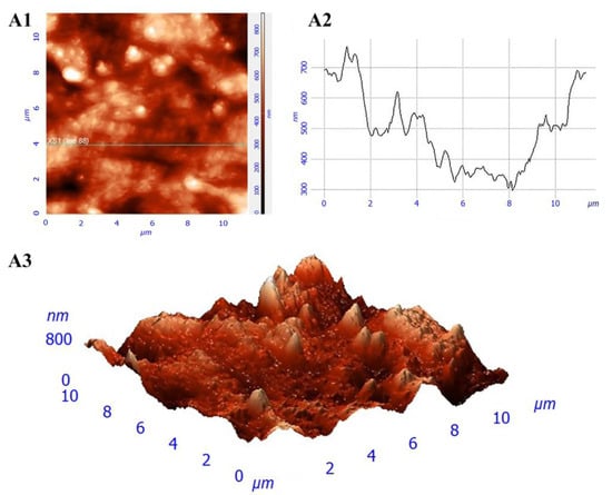 The surfaces of the films had a micro- and nano-relief (Figure 1A,B). There were no pores in the revealed structure of the films. The roughness of the obtained films was 36.5 ± 10.6 nm (Figure 2).