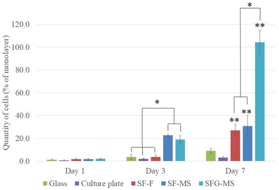 On the seventh day, the proliferative activity of the cell on constructions was significantly higher than on the control samples (Figure 5, **). The highest level of cell proliferative activity was observed on SFG-MS, in which cells formed a dense monolayer (Figure 5, *). The cell proliferative activity on SF-F and SF-MS did not differ significantly.