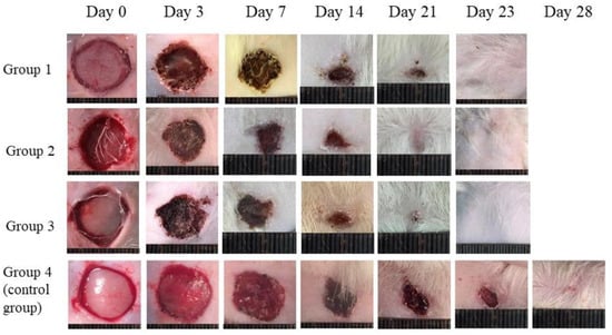 On the 0th, 3rd, 7th, 14th, 21st, 23rd, 28th and 40th days of the experiment, images of wounds were obtained (Figure 6). The images on the 40th day are not shown, due to the wound being healed in all the groups by this time, with the exception of the control group.