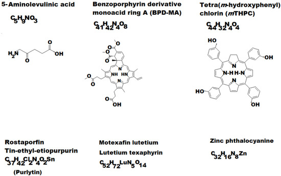 - the second generation (see some examples depicted in Figure 2) allowed a much more accelerated development of PDT (5-Aminolaevulinic acid (ALA); Benzoporphyrin derivative monoacid ring A (BPD-MA) or Verteporfin; Chlorins sold as Purlytin; Tetra(m-hydroxyphenyl)chlorin (mTHPC) or Foscan; Lutetium texaphyrin with tradename Lutex or Lutrin; 9-Acetoxy-2,7,12,17-tetrakis-(β-methoxyethyl)-porphycene or ATMPn; Zinc phthalocyanine (CGP55847); Naphthalocyanines (NCs) and Porphyrin-type Chromophores (PC) with modified marginal operation by different functional groups, such as nitrophenyl, aminophenyl, hydroxyphenyl, pyridiniumyl derivatives etc. [7,27,28,29].