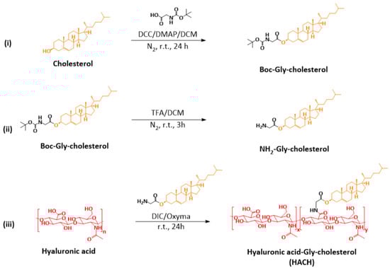Synthetic pathway of HACH. In the first step, cholesterol was modified with Boc-Gly-OH by DCC/DMAP esterification. In the second step, the Boc group was removed under acidic conditions by TFA to produce NH2-Gly cholesterol. In the final step, NH2-Gly-cholesterol was conjugated to the carboxylic group of HA by DIC/Oxyma activation. (i) Modification of cholesterol; (ii) deprotection of Boc-Gly cholesterol; (iii) conjugation of Gly cholesterol on HA.