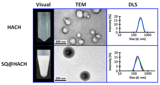 Visual appearance, TEM images and particle size distribution of HACH and SQ@HACH. The Size distribution was measured by DLS under 100-fold dilution of sample stock in water; colorful lines represent three different measurement results.