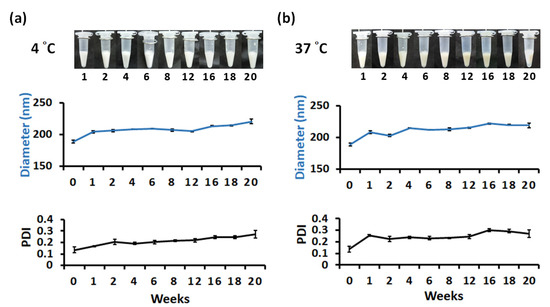 Upon storage at 37 °C, the physical appearance of SQ@HACH did not obviously change during the first 12 weeks, but it gradually changed from a milky white emulsion to a light-yellow emulsion after 12 weeks (Figure 3b). This gradual color change may be assumed to be caused by the accelerated oxidation of squalene at high temperatures [39]. A significant increase in particle size was detected from approximately 190 nm to 215 nm during the first 4 weeks. Next, the particle size was maintained in the range of 210−220 nm between week 4 and week 16. After 16 weeks, the particle size remained at approximately 220 nm; however, the PDI slightly increased during this period. At week 20, slight emulsion delamination occurred, and both the particle size and PDI increased.