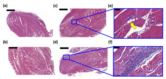 Histological analysis of the injection site in the quadriceps muscles. C57BL/6 mice were immunized with 100 μL of (a) 10 mM sodium citrate solution, pH = 6.5, (b) OVA 50 μg, (c,e) OVA 50 μg with SQ@HACH, and (d,f) OVA 50 μg with AlPO4 (aluminum content 30 μg) at quadriceps. The quadriceps muscle tissues were removed on day 14 and stained by H&E staining. The muscle sections were observed by microscopy at magnification (10× and 40×). Scale bar: 1000 μm (a–d) and 50 μm (e,f). The yellow arrow indicates the vesicles of SQ@HACH.