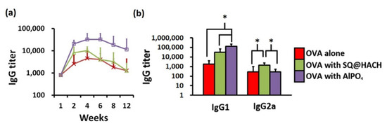 The impact of adjuvants on driving OVA-specific IgG antibodies in mice (n = 6 per group) treated with OVA alone, OVA with SQ@HACH and OVA with AlPO4 for 12 weeks. (a) IgG (b) IgG subtypes. The serum samples from immunized mice were collected for analysis by ELISA. The IgG subtypes were further analyzed in Week 4 by ELISA. The data are shown as the GMT ± 95% C.I. * p < 0.05.