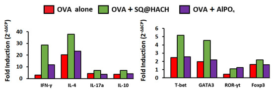 To investigate the effects of SQ@HACH on the subsequent signal transduction of T cells, splenocytes from immunized mice were collected for primary culture without or with OVA stimulation. After 24 h of incubation, mRNA expression was detected by qPCR, and the housekeeping gene beta-actin was used as an internal control for normalization. The fold induction was calculated from the ratio of the expression levels with OVA re-stimulation to those without stimulation. The data show that immunization by OVA adjuvanted with SQ@HACH increased the mRNA expression of IFN-γ (a Th1-type cytokine) and IL-4 (a Th2-type cytokine) compared with the OVA immunization without the formulation (Figure 6). These results are consistent with the mRNA expression of the specific key transcription factors T-bet (Th1) and GATA3 (Th2). We also detected the increased generation of IgG2a antibodies in the mice that received SQ@HACH-formulated OVA after 4 weeks of vaccination (Figure 5b), which predominated Th1 polarization. These findings suggest that SQ@HACH can enhance the related pathways of Th1 and Th2 cells simultaneously during the re-stimulation of OVA. It is important to note that the splenic cytokine secretion responses and serum IgG2a antibodies induced by OVA with AlPO4 adjuvant were the same as those induced by OVA alone, which is in agreement with the literature [40].