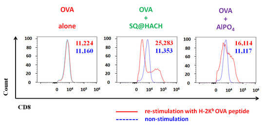 Cytotoxic T lymphocyte (CTL) immunity functions as the main defense against cancer and viral infections. In order to study whether SQ@HACH generated antigen-specific CTLs, splenocytes from immunized mice were collected and re-stimulated for 24 h with H-2Kb OVA peptide (OVA257–264, SIINFEKL), a peptide sequence associated with the phagocytic activity of DCs that can bind to the H-2Kb of MHC class I [52]. As shown in Figure 7, there was no difference in CD8+ cells with OVA257–264 re-stimulation (MFI of 11,224) and those without stimulation (MFI of 11,160) in the OVA-alone group. Interestingly, for the mice that received SQ@HACH-adjuvanted OVA, the MFI increased to 25,000 under the stimulation of OVA257–264 peptide, which was higher than the detected level (MFI of 16,000) in the AlPO4 group. The higher MFI value from the SQ@HACH-adjuvanted group’s splenocytes has a higher CD8 expression cell population than other groups when re-stimulated with OVA257–264 peptide. The upregulated CD8 expression can increase CTL activity against viral infections, a feature also found in COVID-19 patients recently [53]. In summary, the SQ@HACH-adjuvanted vaccine can enhance antigen-specific CTL immunity. An antigen-specific CTL response will be activated to attack when recognizable viral infections and cancer cells are encountered [54,55].