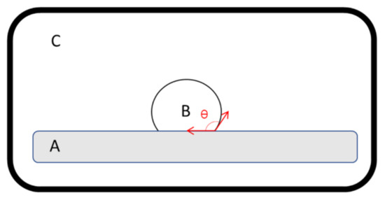 Schematic illustration of the contact angle measurement. (A) High-pressure compressed acyclovir tablet, (B) drop of molten matrix containing PEG 4000 and stearic acid, based on the manufacturing composition, and (C) atmosphere filled with air, helium, or carbon dioxide. The temperature of the apparatus was kept at the melting point of the mixture in an airtight oven. The shape of the molten matrix droplet was imaged, and the contact angle was determined.