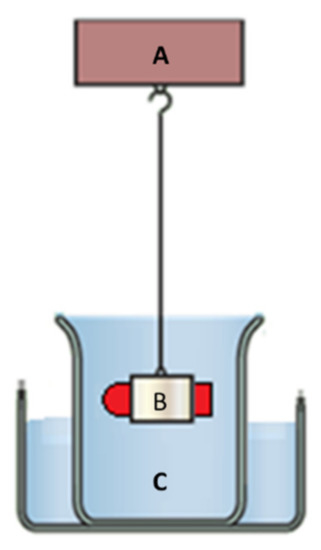 Buoyancy measurements. The net holder (B) is attached to a very sensitive balance (A) while immersing in the release medium (C) along with the samples. Since the net holder is directly mounted to the tensiometer, the rising force can be calculated directly from the weight changes of the net.