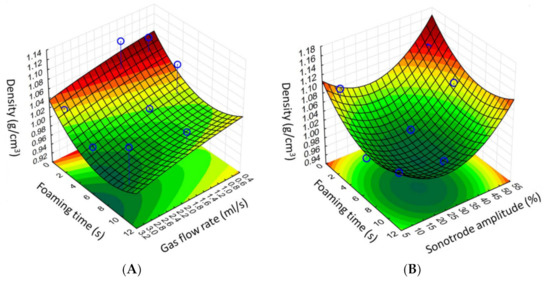 Batch production was optimized using a Box–Behnken experimental design [23]. The independent variables were the gas flow rate (mL/s), foaming time, and sonotrode amplitude (%), and these were considered critical parameters in the production process with an effect on product density (g/cm3). These three experimental factors varied in design at 3 levels in 12 runs. The gas flow rate was changed from 0.75 to 3 mL/s, the foaming time from 1.0 to 10.0 s, and sonotrode amplitude was from 10 to 50%. This design was used to investigate the quadratic response surface and to construct a second-order polynomial model using TIBCO Statistica® 13.4 (StatSoft Hungary, Budapest, Hungary).