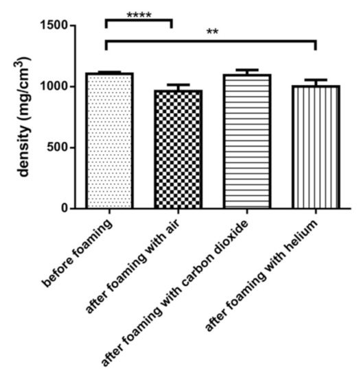 Atmospheric pressure air, carbon dioxide, and helium were used to create foam with the determined optimal parameters. The density of the product is presented in Figure 5. Air was readily available, and CO2 was used to create dermatological foams. He is a lighter gas than air and CO2 and able to reduce the apparent density of products due to this. In the case of air, we observed a 12% decrease in density, which was sufficient to achieve the buoyancy of the composition from zero minutes. In the case of He, we obtained a significantly lower density than before foaming, and the difference between air and helium was not significant. A negligible decrease in density was observed for CO2 that was not significant.