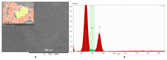 Chemical element analysis shows that API is in solid crystal form (yellowish green), and it is separated from the matrix (red) (A). The intensity of the components is represented in the (B). (C: carbon; N: nitrogen and O: oxygen element).