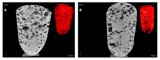Micro-CT images of solid foam structure (A) without and (B) with API after foaming with air. In the right corner of the figures, the distributions of bubbles are indicated in red, which prove the homogeneous distribution of the cavities in the sample, and a heterogeneous bubble size distribution can also be observed.