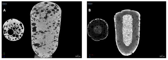 Micro-CT images of solid foam structure (A) at zero time and (B) 10 h after dissolution test. The solid, unwetted core remained in the center of the specimen’s body after 10 h of dissolution (white area in (B)).