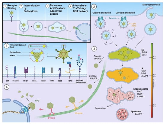 The earliest studies of HAdV intracellular trafficking indicated that different serotypes exhibit different trafficking pathways within the host cell. Depending on the serotype, HAdV capsids either accumulate in the lysosomes (human adenovirus type 7, HAdV7) or are trafficked directly to the nuclear envelope (human adenovirus type 5, HAdV5) []. Currently, the majority of information known about HAdV intracellular trafficking comes from studying HAdVs belonging to subgroups C (human adenovirus type 2, HAdV2 and HAdV5) and B (human adenovirus type 35, HAdV35). These two subgroups use different primary receptors, CAR (HAdV5) and CD46 (HAdV35), directing them toward different internalization mechanisms. Subgroup B serotypes accumulate in lysosomes, whereas subgroup C serotypes traffic rapidly to the nuclear envelope, revealing different kinetics of endosomal escape. Subgroup C serotypes’ optimum pH for membrane lysis matches the one of early sorting endosomes, while subgroup B serotypes’ optimum matches the pH of late endosomes or lysosomes []. Thus, HAdV intracellular trafficking is clearly determined by the initial interaction with the cellular receptor.