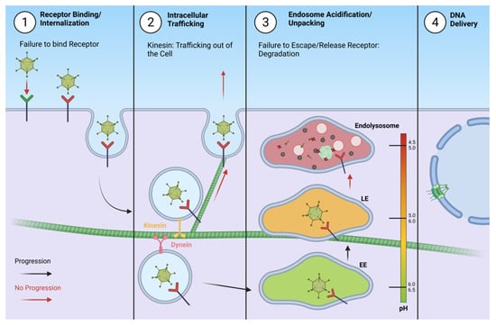 Unsuccessful delivery of the adenovirus genome may occur at several steps during the process of infection. 1. Binding an inadequate receptor that does not allow for internalization. 2. Vesicle trafficking via kinesin may lead to exocytosis of the virion. 3. Inability to escape the endosome due to firm binding of the receptor may cause accumulation and eventually lead to degradation in the endolysosome. 4. Unsuccessful infection prevents genome delivery and production of progeny virions.