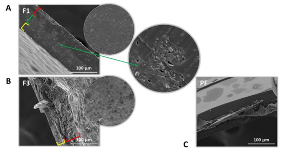 SEM analysis picturized the multilayer character of the films formed (Figure 1A–C). Both polymer’s layers were clearly displayed, however the layer of interacting CS and PC might have been indicated as the porous area of the films F1 with the accumulated particles of CLO (Figure 1A). The interpenetrating and ionically interacting polymeric chains of the casted CS through the preliminarily jellified PC layer might have resulted in the loose structure of the middle part of the films. Similar observations were made by Kononova et al. and Petrova et al. [17,61], where particular order of polymers mixing (polyanion as the first one) resulted in the porous interfacial layer of PEC formed. Morphological evaluation of the drug–deprived formulation PF showed the explicitly separated layers of CS and PC and most probably firm and brittle interlayer of a polycomplex (Figure 1C).