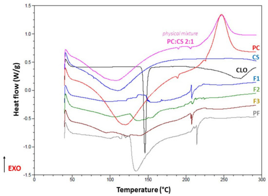 DSC thermograms for PC, CS, CLO, F1–F3, placebo films (PF), and the physical mixture of PC and CS at a weight ratio of 2:1.