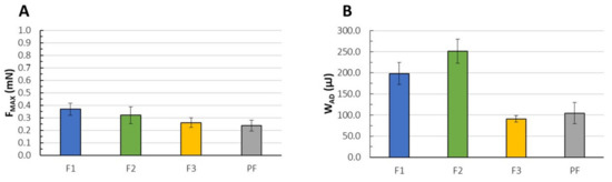 Mucoadhesive properties of the films were assessed with Texture Analyzer TA.XT. Plus (Stable Microsystems, Godalming, UK), according to the previously optimized method [46]. For that purpose, 4 cm2 films were placed on the mucoadhesion ring A/Muc and moisturized with 250 µL of the SS pH 6.8. After 1 min of the thermostating process at temperature 37 ± 2 °C, upper probe with the buccal mucosa attached with a cyanoacrylate glue (round piece with r = 0.5 cm, S ~ 0.785 cm2) was lowered at a constant speed of 0.5 mm/s. Subsequently, the films were kept in contact with a model tissue for next 180 s under an initial contact force of 1 N and then two interacting surfaces were separated at post-test speed of 0.1 mm/s. Process parameters were chosen during the preliminary tests. While the maximum detachment force (FMAX) was recorded by Texture Exponent 32 software (version 5.0, Stable Microsystems, Godalming, UK), the work of adhesion (WAD) was calculated based on the area under force/distance curve as presented below,