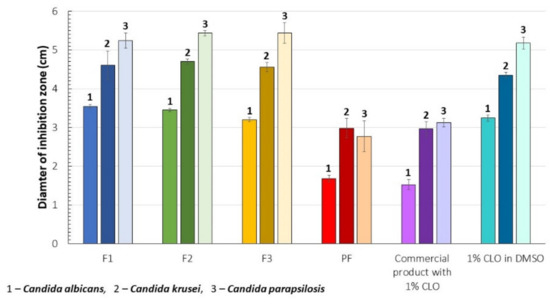 The antifungal behavior of the films was determined against cultures Candida albicans ATCC® 10231, Candida krusei ATCC® 6528, and Candida parapsilosis ATCC® 22019 according to the agar diffusion method of Clinical and Laboratory Standards Institute (CLSI), by using Sabouraud’s dextrose agar [47]. The inoculum of fungi was prepared with 0.9% sodium chloride and its target optical density of 5 × 106 colony forming units per milliliter (CFU/mL) was determined by spectrophotometric method at 550 nm (Genesys 10S UV–Vis spectrophotometer, Thermo Scientific, Madison, WI, USA). After seeding of 100 μL of Candida species inoculum on a Petri dish, films pieces with diameter of 5 mm were carefully placed on the agar surface. Simultaneously, 100 μL of 1% (w/v) CLO dissolved in DMSO and 100 mg of the commercially available product with 1% (w/w) CLO were analyzed. The plates were subsequently incubated at 37.0 ± 0.1 °C either for 24 h (C. albicans, C. krusei) or 48 h (C. parapsilosis). After that time, the inhibition zones were measured [48]. For pure DMSO, no effect on the fungi proliferation was observed.