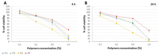 The cells were seeded in 96-well plates at a density of 2000 cells/well, adhered overnight, then formulations F1–F3 and PF at polymers concentration of 0.2% and 0.5% were added and cultured at 37 °C, 5% CO2 for 24 h. To detect apoptosis and necrosis, Real-Time–GloTM Annexin V Apoptosis and Necrosis Assay Kit was utilized. This assay measures the exposure of phosphatidylserine (PS) on the outer leaflet of the cell membrane during the apoptotic process. H2O2 (50 mM) was used as the positive control.