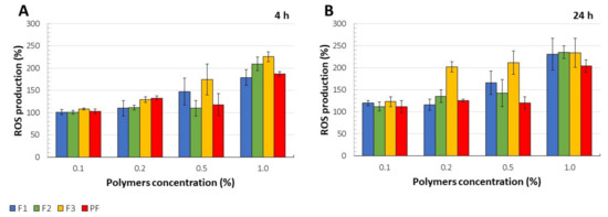 The DCFH–DA (2′,7′–dichlorodihydrofluorescein diacetate) fluorescence method was used to detect the intracellular level of reactive oxygen species (ROS) [54,55]. Briefly, 2 × 104 cells were grown in 96-well plates for 24 h, and then incubated with 20 mM DCFH–DA for 30 min in the dark. DCFH–DA is a non-fluorescent dye easily permeable into cells and then hydrolyzable by intracellular esterase to DCFH storage in the cells. At the end of DCFH–DA incubation, cells were washed with PBS. Cells were then treated with F1–F3 and PF films for 24 h. After washing, the formation of fluorescence dichlorofluoroscein, which is the oxidized product of DCFH–DA in the presence of several ROS (primarily hydroperoxide), was determined at 400/505 nm. Results were expressed as the fluorescence intensity.