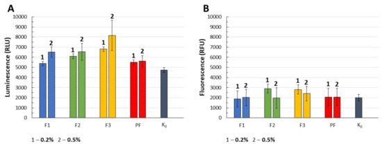 Intensity of luminescence signal as a sign of apoptosis (A) and fluorescence signal as a sign of necrosis (B) recorded for F1–F3 and placebo films (PF) at concentrations of 0.2% and 0.5% with reference to the negative control K0 (untreated cells). For the positive control (50 mM H2O2), luminescence was 964542.28 ± 32319.18 RLU and fluorescence–35750.39 ± 2510.64 RFU (mean ± SD, n = 5, p < 0.05).